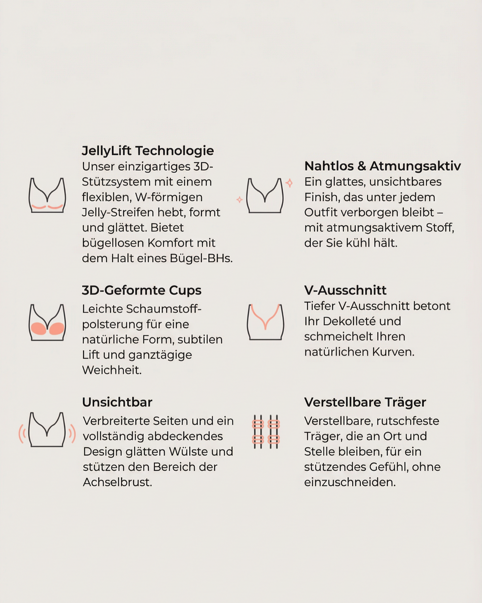 Unsere bügellosen BHs verfügen über ein innovatives 3D-Stützsystem, das mit einem flexiblen Liquid-Jelly-Streifen ausgestattet ist. Diese W-förmige Struktur bietet einen ausgewogenen, natürlichen Lift und Formgebung – ganz ohne den Druck eines herkömmlichen Unterbügels.