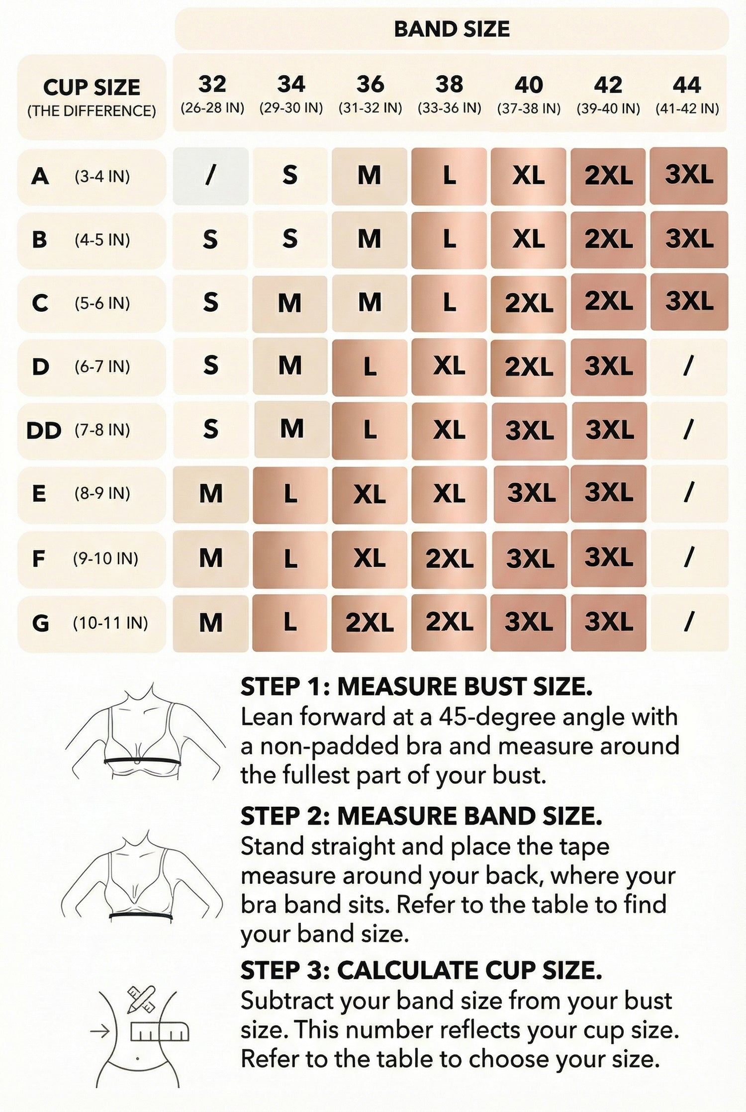 Measure both your underbust and bust to determine the correct band and cup size. Use the size chart on the product page for guidance. We offer sizes from S to 3XL, along with helpful measuring tips.