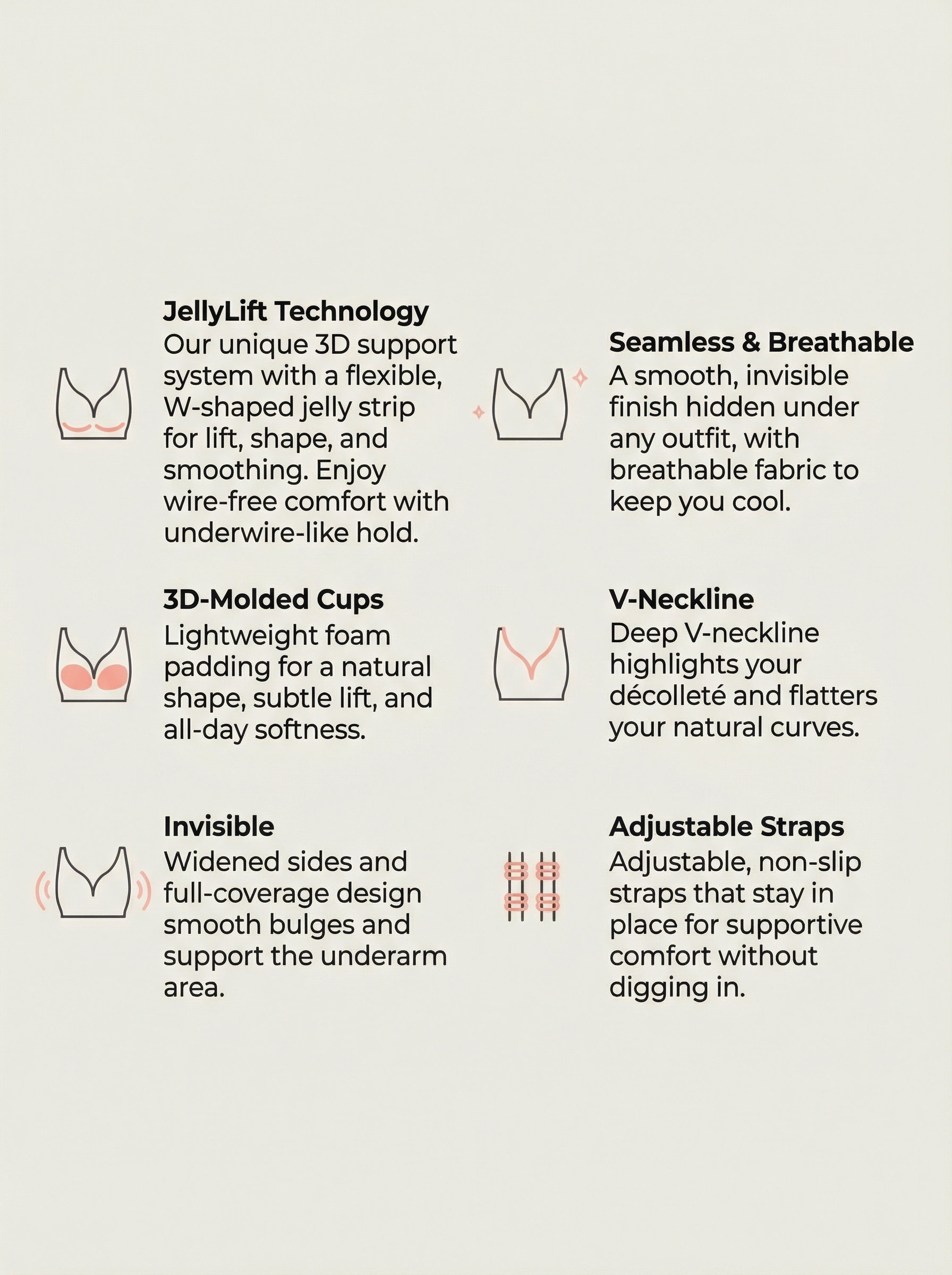 Discover ultimate comfort and stylish elegance with our seamless, wireless jelly bra with soft V-neck and full support that lifts, shapes, and supports – completely wire-free. Thanks to innovative W-shaped gel strips and a 3D cup design, this bra offers natural lift, enhances your silhouette, and remains virtually invisible under clothing.